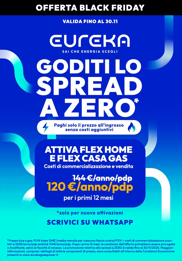 È l’offerta di Eureka Gas&Power per il Mercato Libero dedicata alle nuove attivazioni per i Clienti Domestici che in occasione del Black Friday offre costi di commercializzazione scontati a 120€/anno/pdp anziché 144€/anno/pdp e Spread a Zero.
